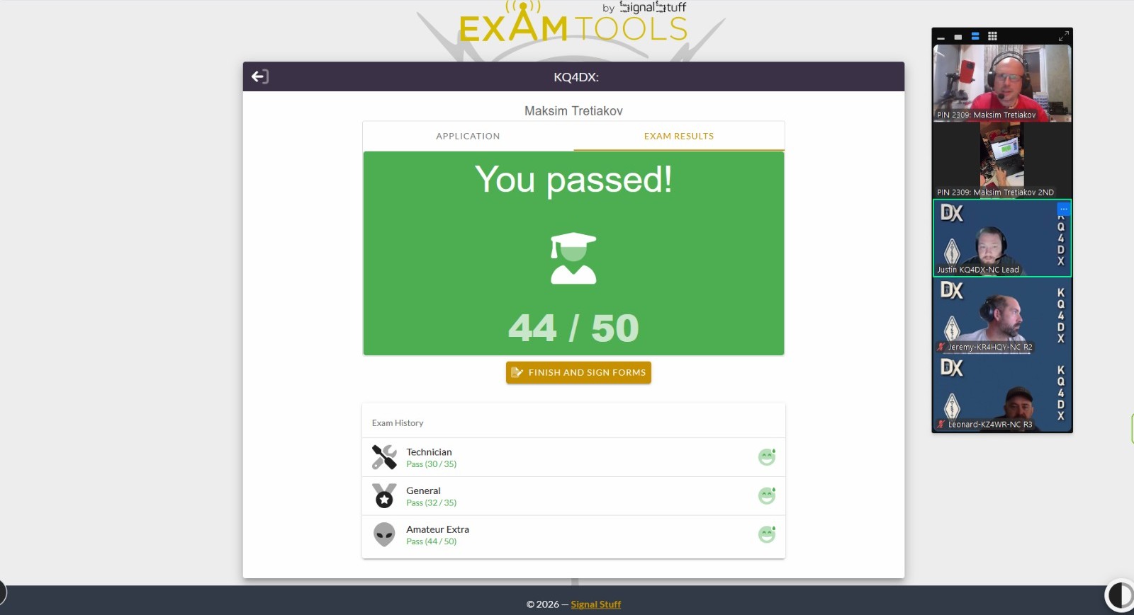 The exam was 1h10m of pleasure. Thank you, Justin (KQ4DX), very much! Thank you, guys! You did it perfectly! I very hope more hams, particularly, from outside of the US, will follow my path, since it is a real fun and freedom!
