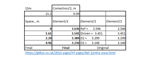 - https://g0ksc.co.uk/2013-yagis/hf-yagis/4el-21mhz-owa.html – I built a couple of this 15-m antennas – they are shorty and sturdy and tune very well – OWA rules overall. These dimensions I had to increase by 10 cm of each side – see the table (original and final) – which is a lot