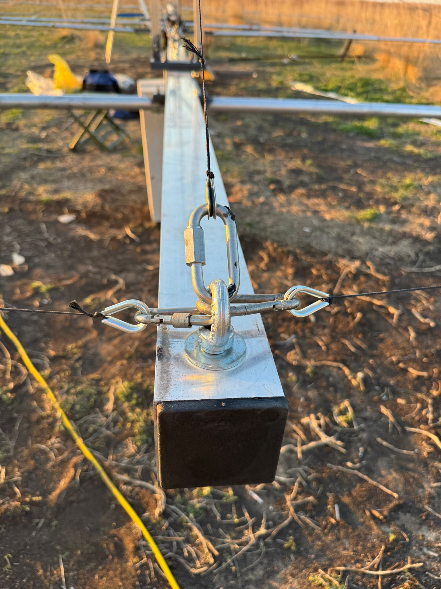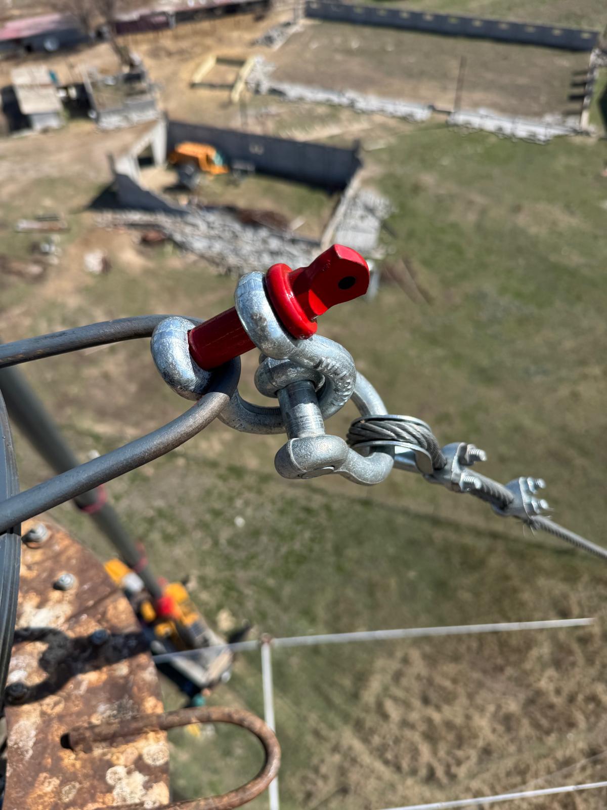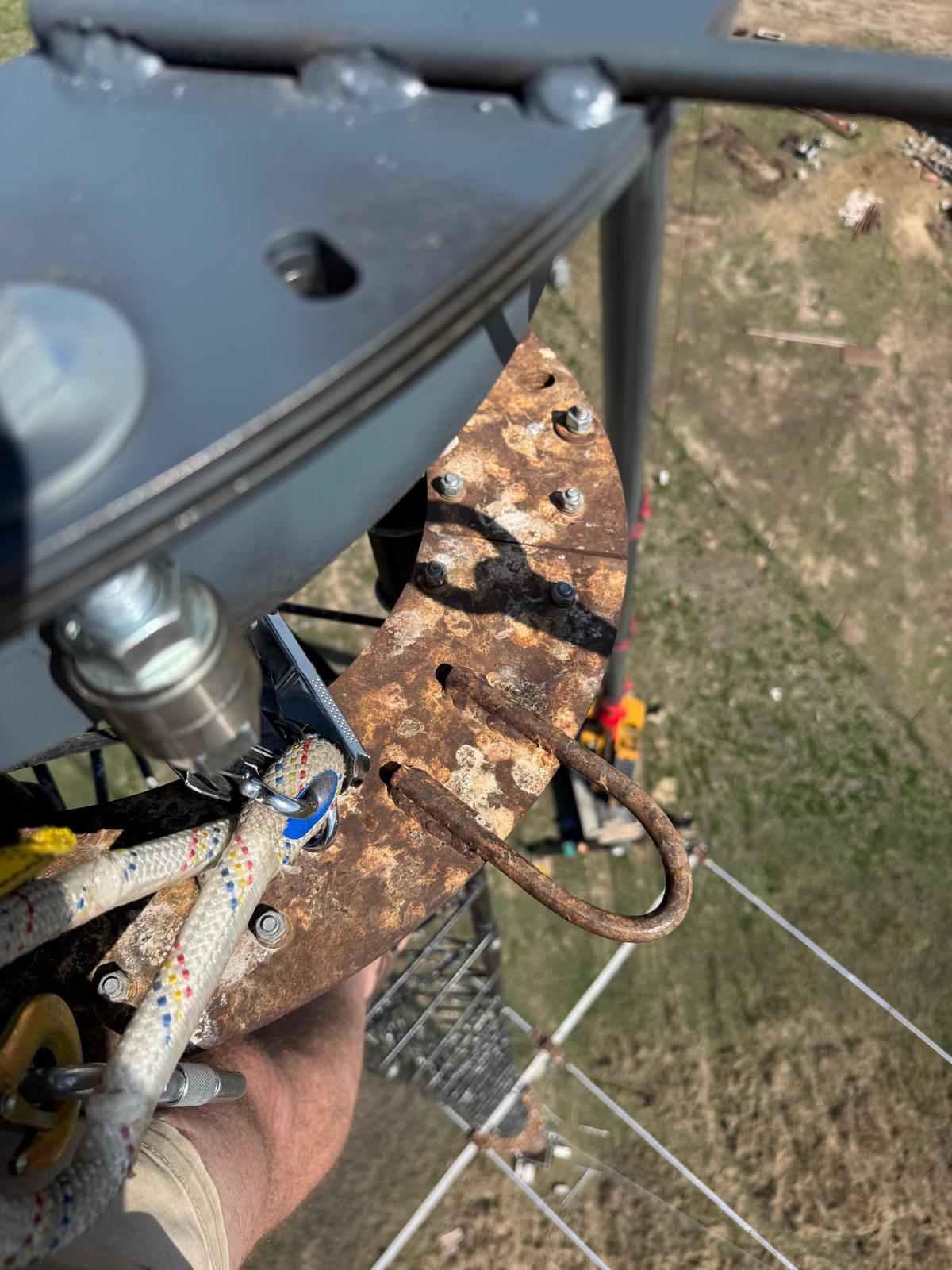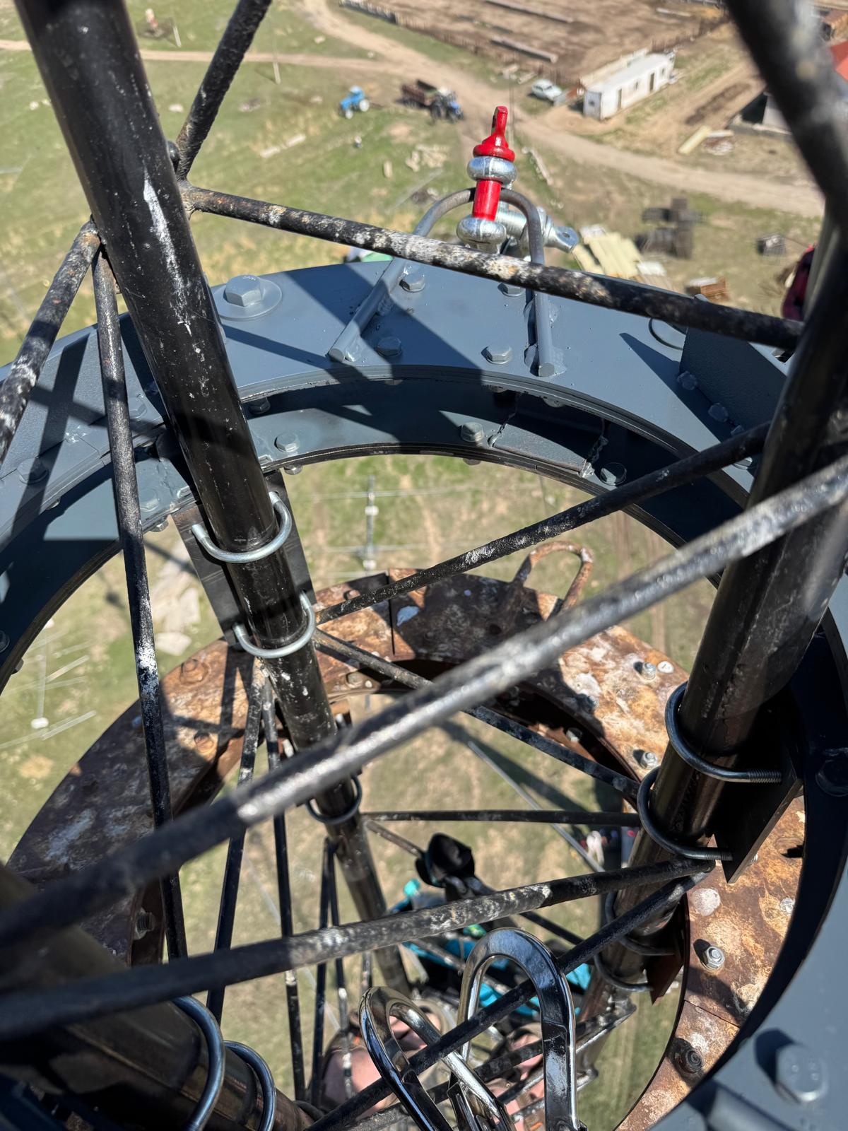- To switch the guys from the old bearing to the new one. That was a tough call because you are being attached to the tower, which is being held by the very same guys that you plan to switch while on the tower … – the switching moment is highly risky. To minimize the risks: we kept the crane holding the tower from the top – it would keep it in place in case I lose or drop the guy. A winch was used to pull the guy but then I had to press the guy with one of my leg, while balancing the remaining leg … – and everything on the 38-meter height …Â