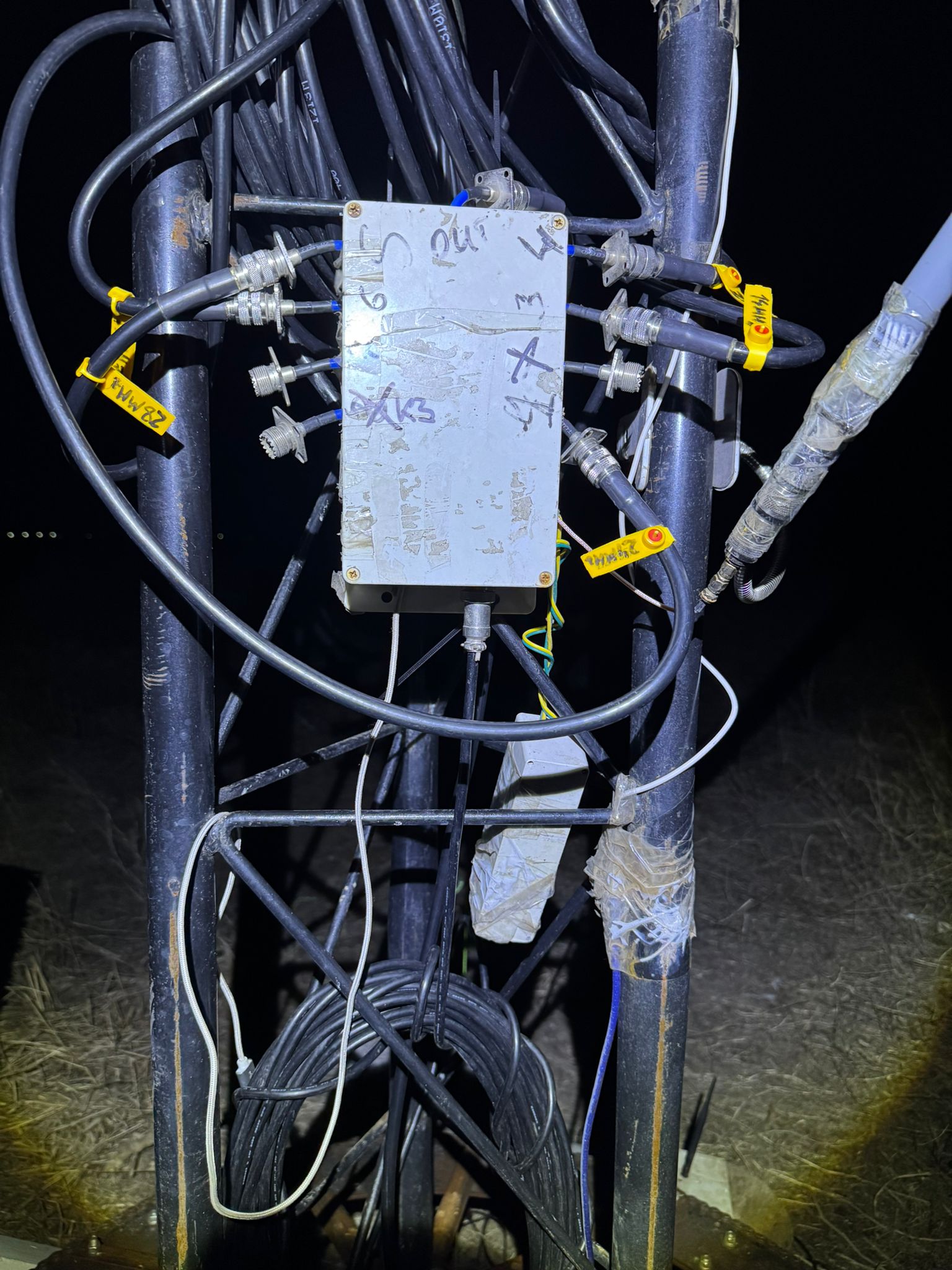 - When I climbed the tower, I learnt that 3 out of 4 bolts are mysteriously absent; the rotator has shifted from the center and broke its own connector. I had to replace them with whatever I had suitable in my bag and tightened the screw. The event is quite mysterious … either not all four screws were in place, or they unscrewed somehow … the mast was visibly vibrating and resonating with the guys … It is very suspicious…